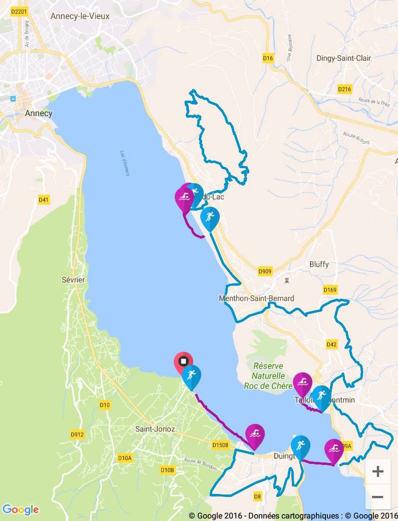 Les kilomètres de montées s’enchainaient avec pour point d’orgues cette vu splendide depuis « le rocher des Moillats » duquel nous avons pus apercevoir le 1er binôme à la sotie de l’eau à Duingt de l’autre coté du Lac, impressionnant!!!