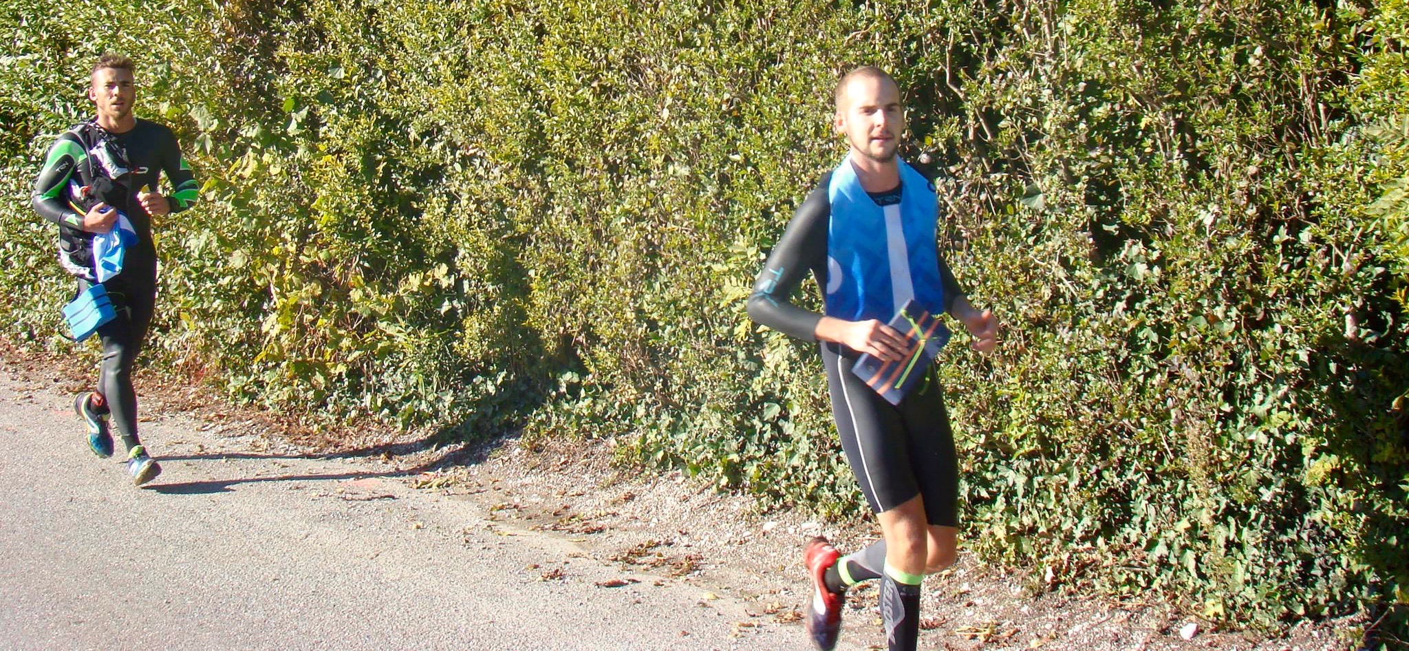 Les 3km de « plat » avant la nage furent interminables, on commença à s’équiper tôt pour gagner du temps ! Non, non je rigole pas après avoir été dans les choux toute la course les gars se la joue compétition.